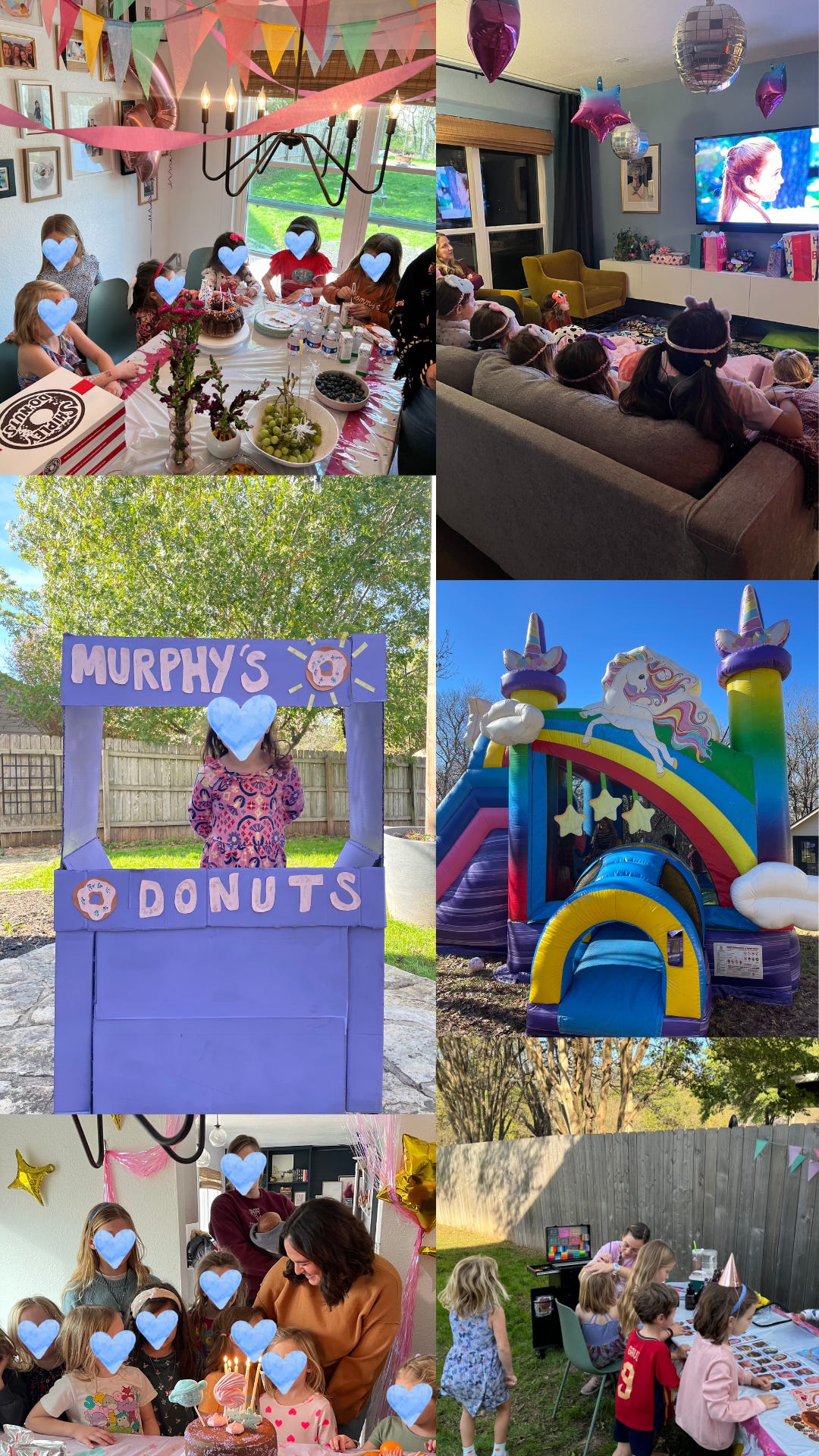 This year, my oldest wanted a movie party so we had a night party for the first time ever. Because she was older this worked because she understood her party was later. The theme was just “girly” so I got an iridescent table cloth, hung disco ball balloons from the ceiling, and found cute paper plates at HomeGoods. The big activity was watching the movie, the small activities were a scavenger hunt to find sleep masks and painting nails, the food was popcorn with lots of candy they could mix in, and I had sparking water and rosé wine for the adults. Same formula, just pushed back to a 6:30 start time.